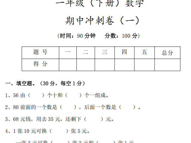 【小学数学】一年级下册期中冲刺卷(西师大版)