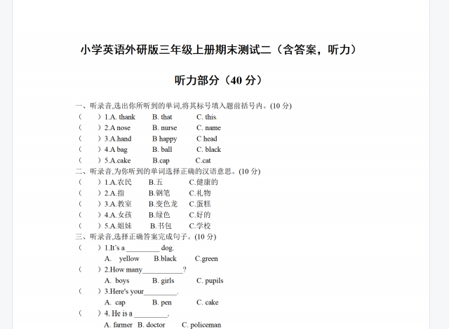 【小学英语】三年级上册期末测试卷(4)听力(外研版)