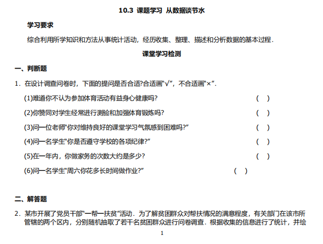 【初中数学】七年级下册10.3课题学习从数据谈节水(人教版)
