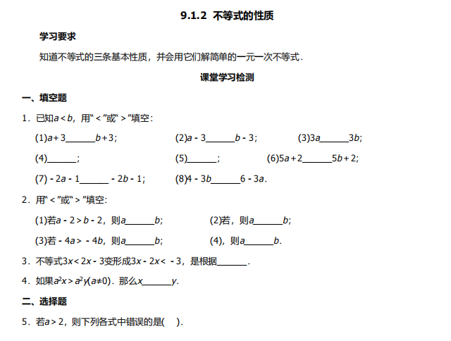 【初中数学】七年级下册9.1.2不等式的性质(人教版)