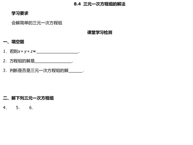 【初中数学】七年级下册8.4三元一次方程组的解法(人教版)