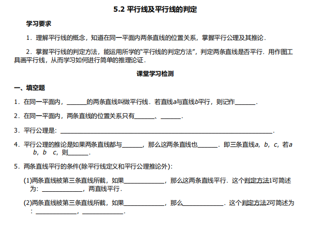 【初中数学】七年级下册5.2平行线及其判定(人教版)