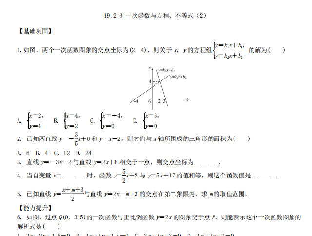 【初中数学】八年级下册19.2.3 一次函数与方程、不等式2(人教版)