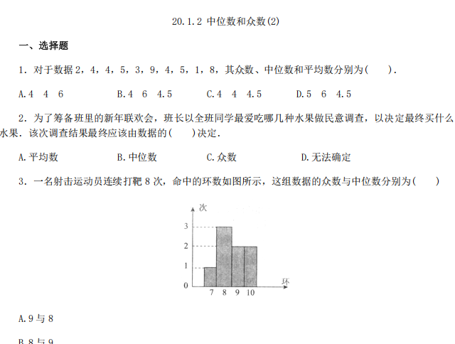 【初中数学】八年级下册20.1.2 中位数和众数2(人教版)