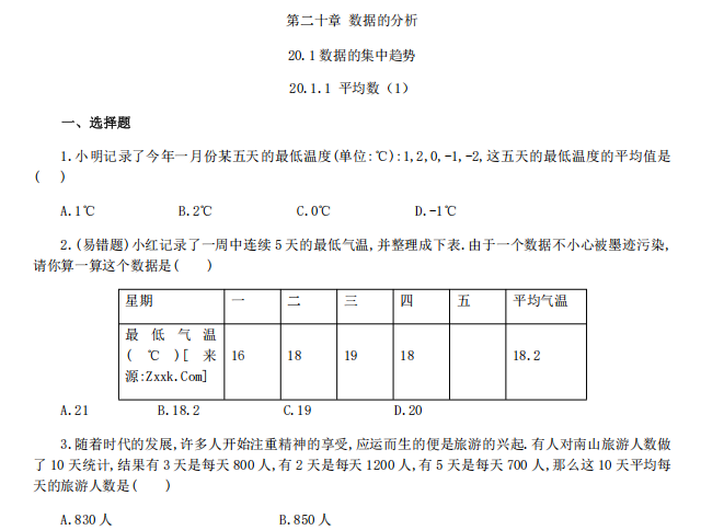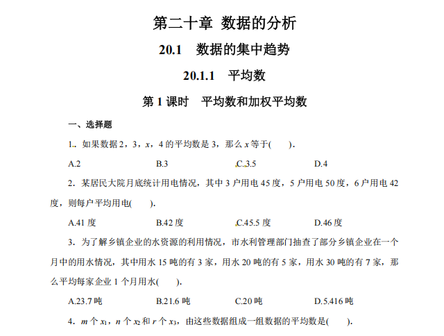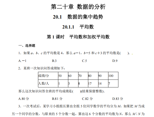 【初中数学】八年级下册20.1.1 平均数1(人教版)