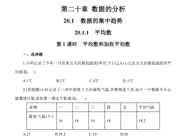 【初中数学】八年级下册20.1.1 第1课时 平均数和加权平均数1(人教版)