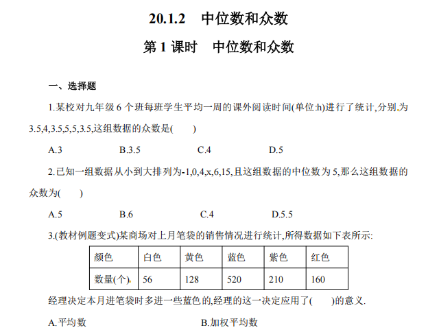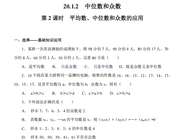 【初中数学】八年级下册20.1.2 第2课时 平均数、中位数和众数的应用(人教版)