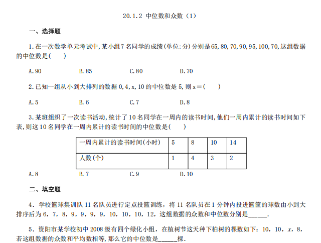【初中数学】八年级下册20.1.2 中位数和众数1(人教版)
