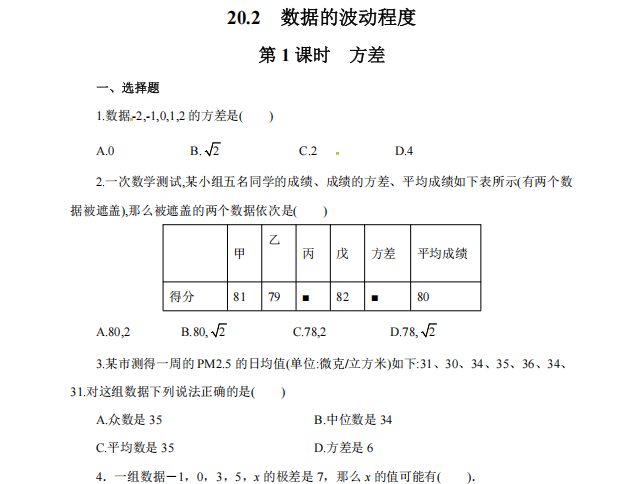 【初中数学】八年级下册20.2 第1课时 方差(人教版)