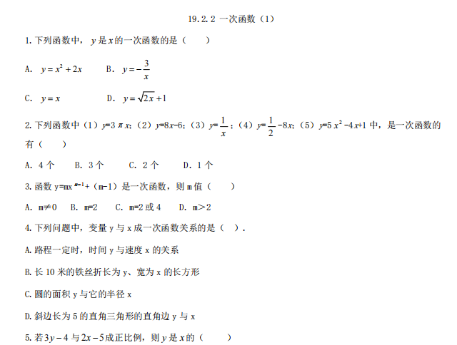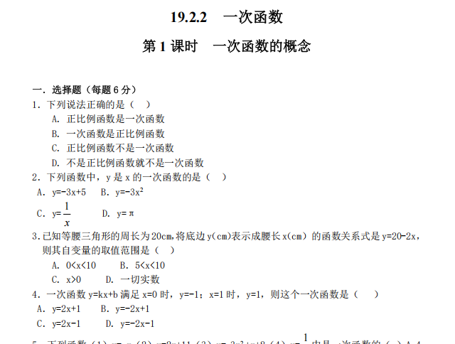 【初中数学】八年级下册19.2.2 第1课时 一次函数的概念(人教版)