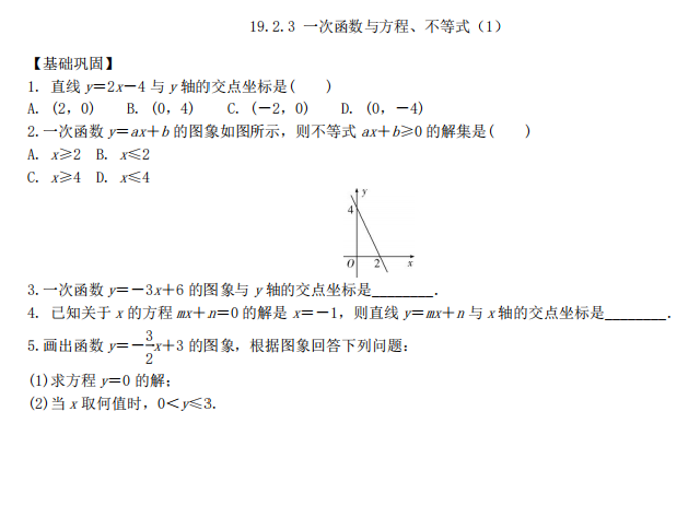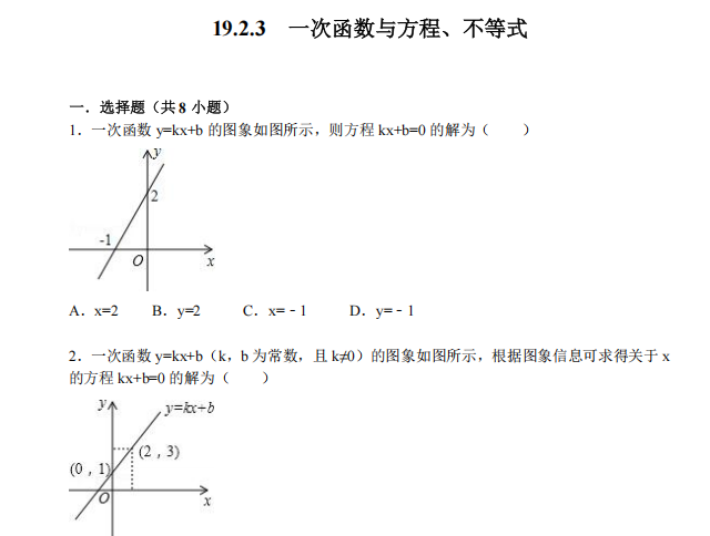 【初中数学】八年级下册19.2.3 一次函数与方程、不等式(人教版)